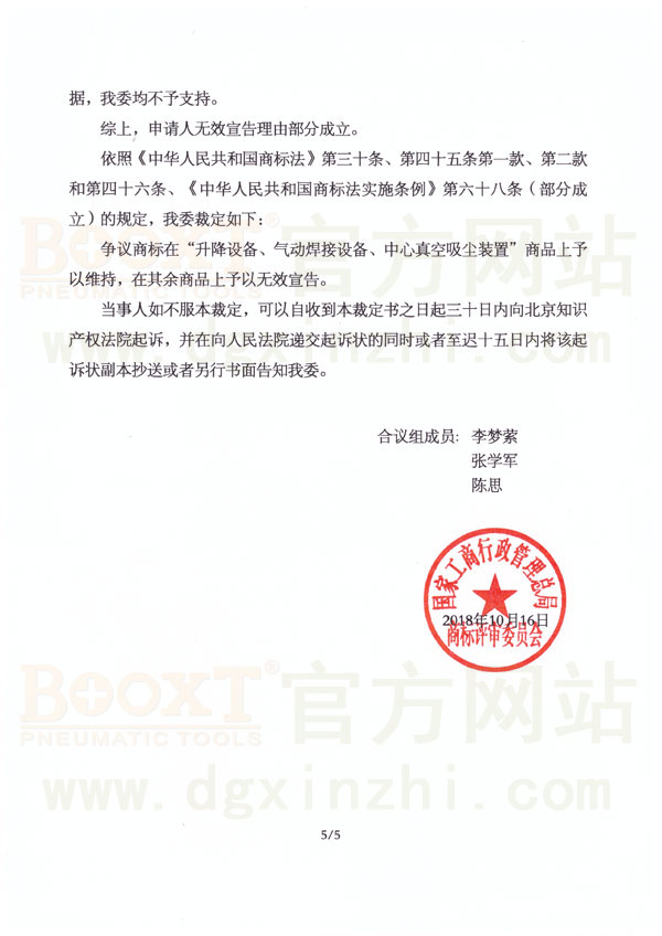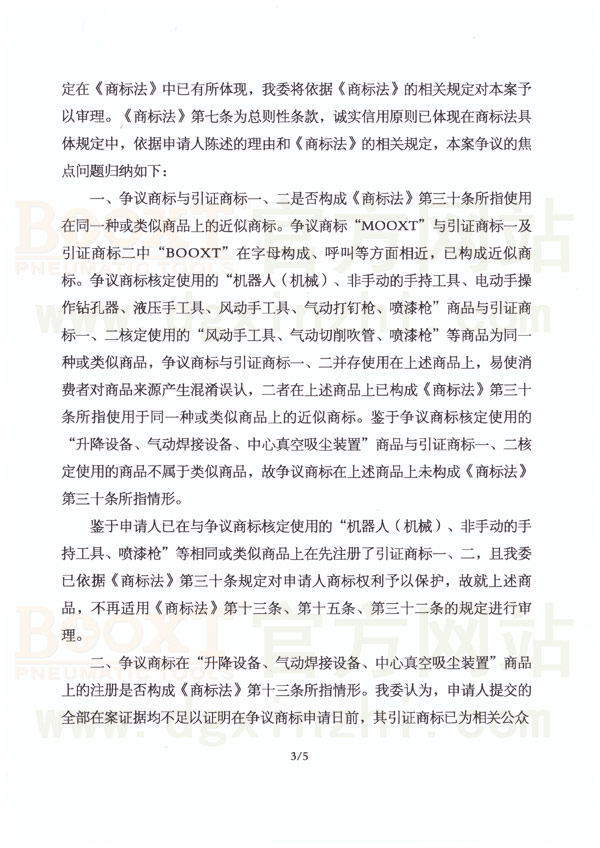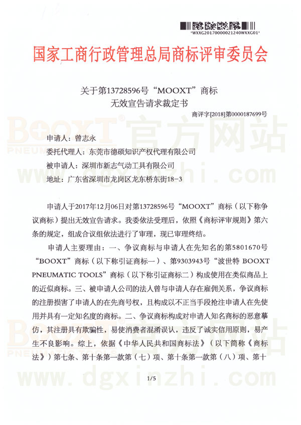 但是最近幾年我們收到多宗投訴,說BOOXT的工具沒有以前好。我們調(diào)查發(fā)現(xiàn)出問題的機(jī)器為“MOOXT”品牌,LOGO和包裝等均非常類似,這是影響惡劣的品牌‘擦邊球’事件。很多用戶均會(huì)誤認(rèn)為是“BOOXT”品牌。所以我司舉起法律武器,向【國(guó)家工商行政管理總局-商標(biāo)評(píng)審委員會(huì)】提起申訴,于2018年10月16日最后評(píng)審結(jié)果MOOXT氣動(dòng)工具品牌宣告無效。