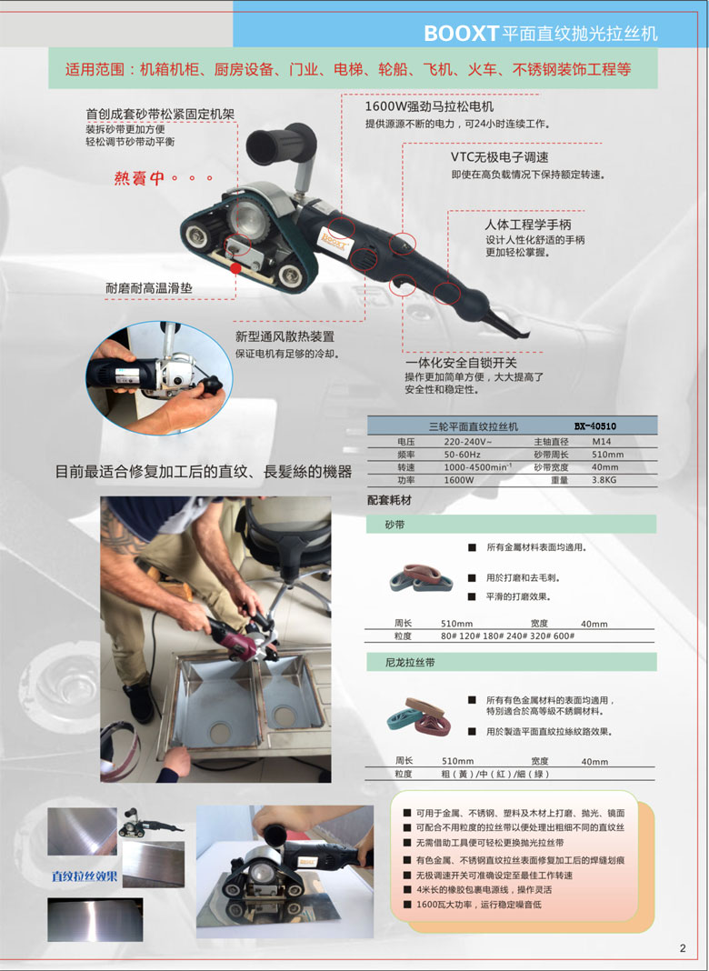 1)適用于機箱機柜、廚房設(shè)備、門業(yè)、電梯、輪船、飛機、火車動車、不銹鋼裝飾等平面直紋拋光拉絲作業(yè)。