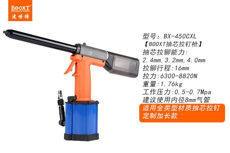東莞市強勁五金工具有限公司提供臺灣BOOXT波世特品牌氣動工具,深孔氣動拉鉚槍BX-450CXL廠家直銷,首件享特價。咨詢熱線:4008301980