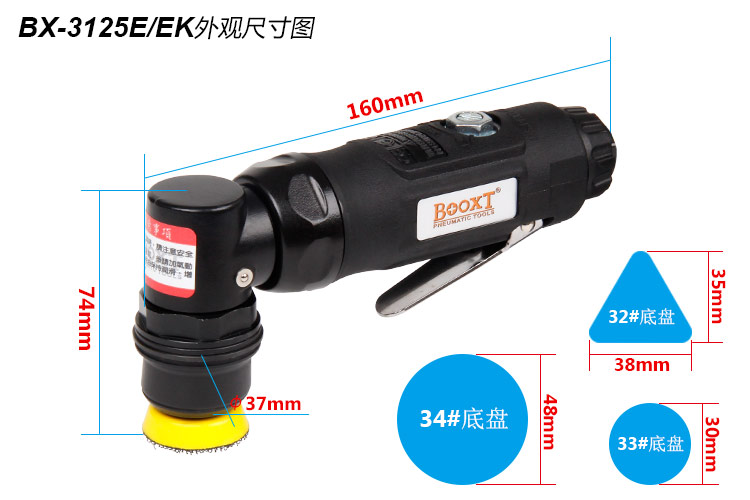 • 產(chǎn)品參數(shù): 底盤尺寸: 圓形:30mm (1寸) 圓形:48mm (2寸) 三角形:35*38mm 偏擺直徑:2mm 馬達(dá)功率:0.35hp 空載轉(zhuǎn)速:13000rpm 頭部高度:74mm 機(jī)身長度:160mm 重 量:0.52kg 耗 氣 量:0.26m3/min 【套裝】