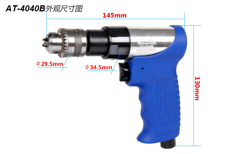 • 產(chǎn)品參數(shù): 夾頭尺寸:1.0-6.5mm 【1/4"】 馬達功率:0.3hp 空載轉速:2800rpm 全 長:145mm 重 量:0.70kg 耗 氣 量:0.5m3/min 【單向設計/工業(yè)型】