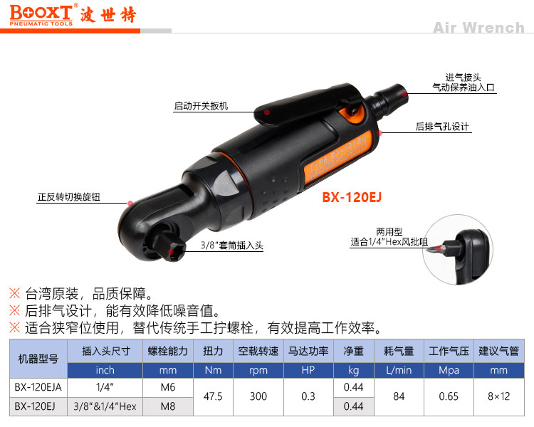 東莞市強(qiáng)勁五金工具有限公司提供臺(tái)灣BOOXT波世特品牌氣動(dòng)工具,兩用氣動(dòng)棘輪扳手BX-120EJ廠家直銷(xiāo),首件享特價(jià)。咨詢(xún)熱線(xiàn):4008301980