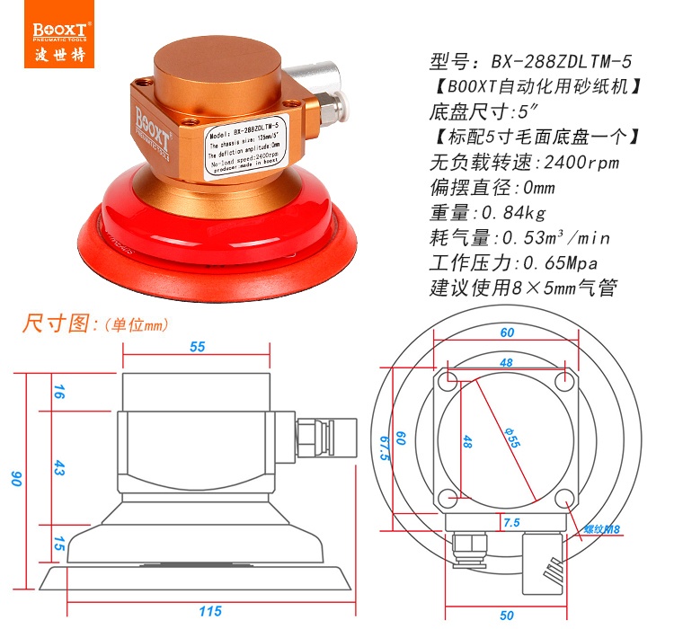 • 產(chǎn)品參數(shù): 底盤尺寸:125mm 【5寸】 偏心尺寸:0mm (同心) 空載轉(zhuǎn)速:2400rpm 重 量:0.84kg 耗 氣 量:0.53m3/min 【同心/慢速】