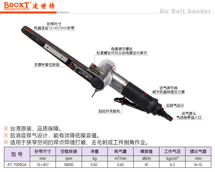 東莞市強勁五金工具有限公司提供臺灣BOOXT波世特品牌氣動工具,AT-7009GA圓手柄風動砂帶機廠家直銷,首件享特價。服務(wù)熱線:4008301980