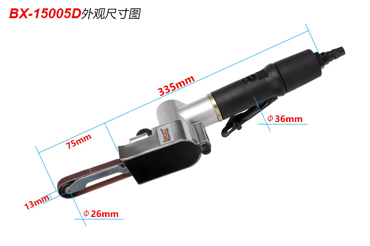 • 產(chǎn)品參數(shù): 砂帶尺寸:10*330mm 空載轉(zhuǎn)速:25000rpm; 工具長(zhǎng)度:335mm; 工具重量:0.86kg; 耗 氣 量:0.65m3/min; 噪 音 值:82db(A) 使用工作氣壓:0.65Mpa; 推薦使用內(nèi)徑8mm氣管; 平時(shí)使用應(yīng)多加氣動(dòng)油保養(yǎng)。【工業(yè)型/圓手柄/圓弧打磨】