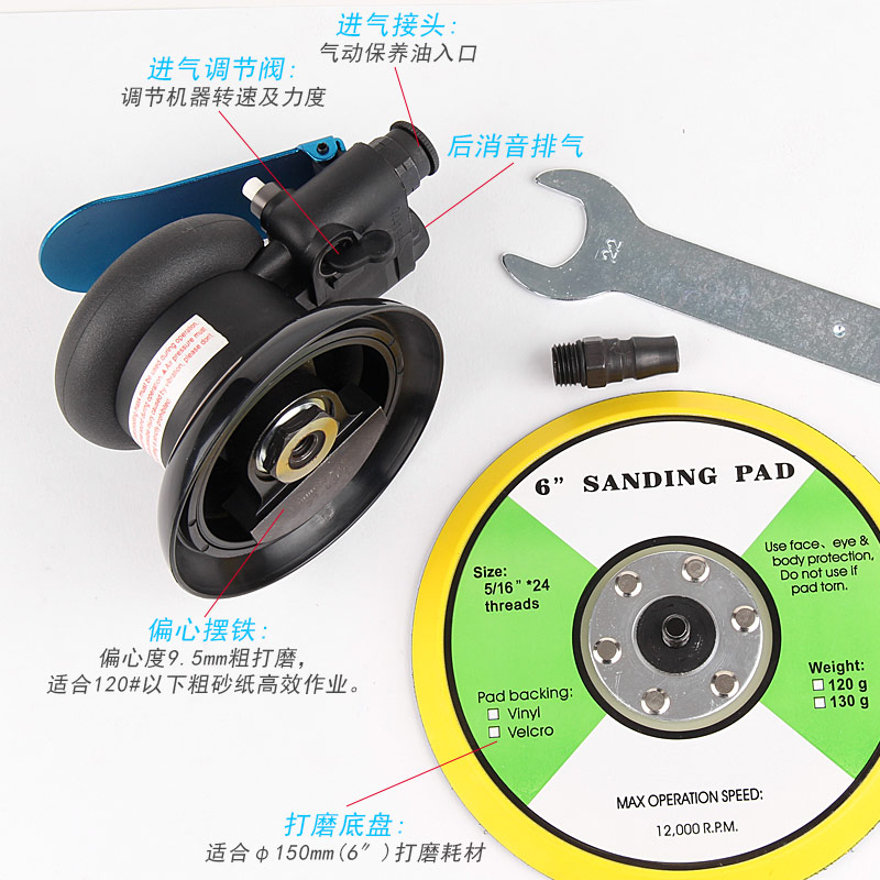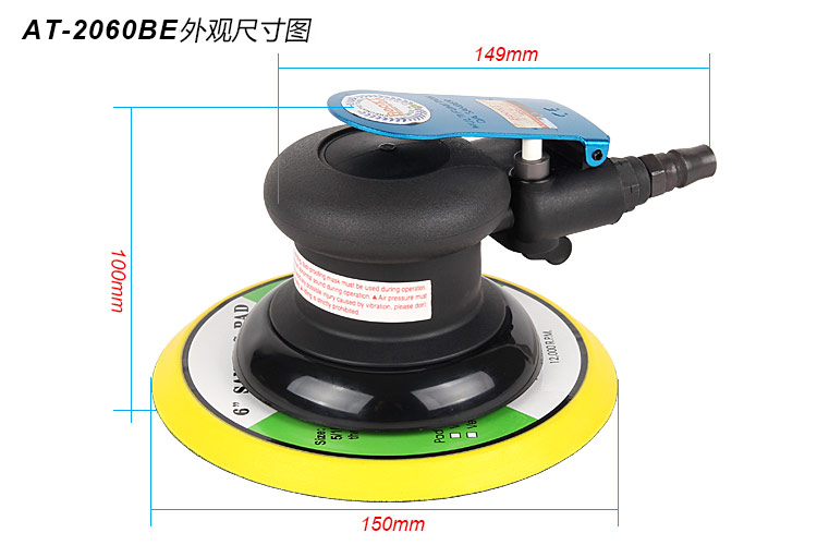 • 產(chǎn)品參數(shù): 底盤尺寸:150mm (6寸) 空載轉(zhuǎn)速:12000rpm 偏擺直徑:9.5mm 重 量:0.93kg 耗 氣 量:0.48M3/min 噪 音 值:75db(粗磨)